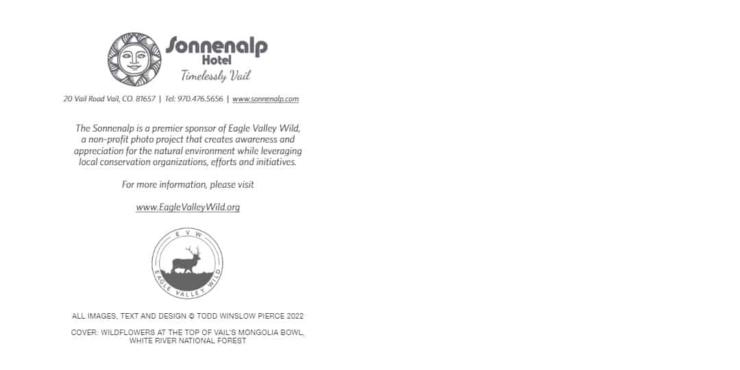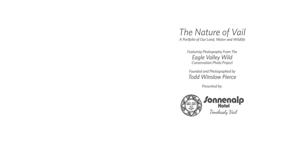 Founded by Photographer and Vail native Todd Winslow Pierce, Eagle Valley Wild (EVW) is a non-profit enterprise that provides professional photographic services and imagery to conservation-related organizations, efforts and initiatives in Eagle County, Colorado. Simultaneously, EVW reveals the beauty & value of Eagle County's land, water and wildlife to the local community and its visitors to increase awareness, appreciation and protection of the region's most important natural assets.